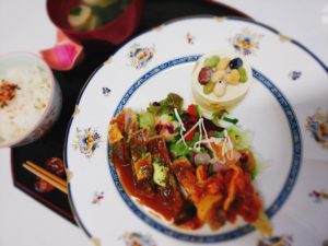 メインメニュー:豚ヒレの詰め物パン粉焼き&豆腐と魚のカレークリーム詰め サラダ添え