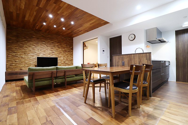 渋い色味、存在感を放つ丸太梁など古民家を思わせる空間を現代的な暮らしに合わせて設計したお住まい。