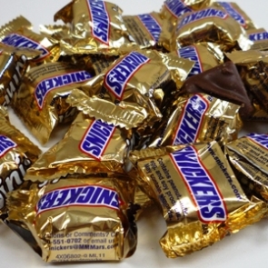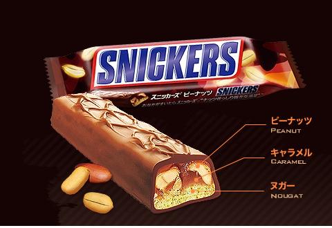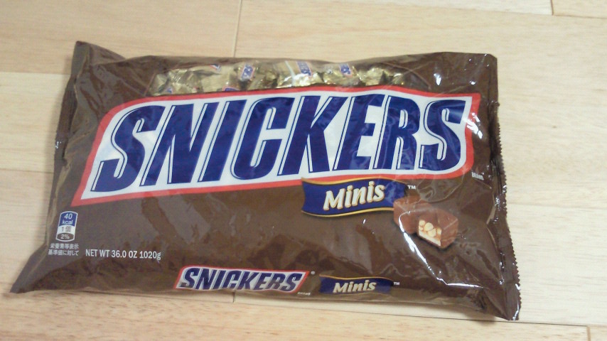 「スニッカーズ」 このフレーズ、30歳以上の方はよくCMで聞いた事でしょう。 「ナッツぎっしり確かな満足」こんなキャッチフレーズもありました。 最近もCMやってるそうですが、富山じゃ放送されてないのか、大人になってTV見てる時間帯が違うからなのか、見かけたことはありません。 で、このスニッカーズ「ナッツぎっしり」な様にピーナッツいっぱい入ってます。 そして、 ピーナッツとキャラメル、ヌガーが合わさる事によって、あのねっとりした中に固いナッツが包まれてる感じに。       ↓ よく噛まないと呑み込めない。       ↓ よく噛む事によって満腹感がよりアップ。       ↓ 「確かな満足!」       ↓ やっぱり、おなかがすいたらスニッカーズよね。 こうなるのが普通ですね。 でも、正直私はよく噛むのあまり好きじゃありません、体にはいいのでしょうけど。 (そもそもスニッカーズ食ってる時点で……) そこで登場するのがこちら。 「スニッカーズミニチュア」 ミニですが袋はでかいです。 中身はこんな感じ。 これ、味はスニッカーズなのに、ナッツの粒が無い(気がする)ので大変食べやすい、ほぼチロルちょこ。 美味しい上にいっぱいあるので、食べ出すと止まらないつД`)・゚・。・゚゚・*:.。..。.:*・゚ ちなみに、「もっとも不健康」なお菓子「スニッカーズパイ」はこちら。 2013年(今年)にスニッカーズ製造中止になるとか噂も聞きますが、実際どうなんでしょう。 人気ブログランキングへ