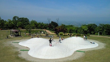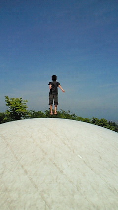 この白い物体、なんと トランポリン なんです~ 地面にへばりついたゴムみたいなかんじで、上に乗ってポヨ~ンポヨ~ンです。 10年以上ぶりのトランポリン 青い空と緑色の草原のあいだをポヨンポヨ~ン 楽しくて笑いが止まりませんでした まさに グリーーンだよー って感じで(笑) 空中で1回転した少年(尊敬…)