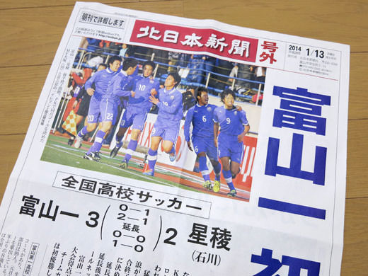 あけましておめでとうございます。 今年もよろしくお願いします。   サッカー全国高校選手権大会、富山第一高校サッカー部優勝しました!!! 富山県が誇るヒーローですね。 会社の社員も仕事そっちのけでサッカー観戦です(笑) 私、中学のときは第一高校にいってサッカーをすると夢見てましたが結局富山工業高校に入学しました。ん~残念。。。 サッカーを見ていて・・・ こつこつ努力すること まわりに感謝すること 最後まで諦めないこと 仲間を信じること そして、監督の99人の息子と娘というコメントからは生徒を想う気持ちが伝わり本当に素敵なチームだと思いました! 私も山下ホームの一員として明日からも頑張ろうと思います! 20140121-01[1]