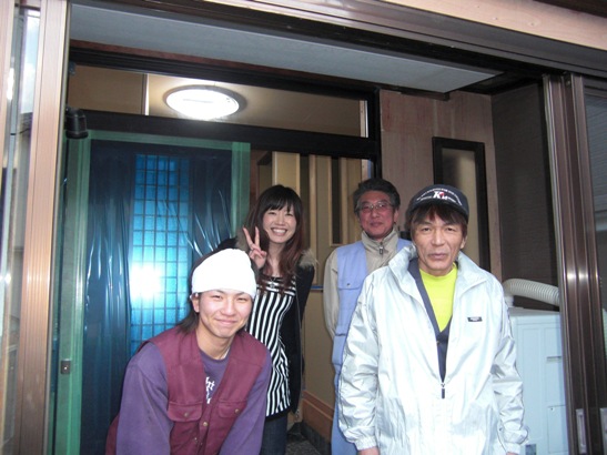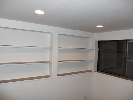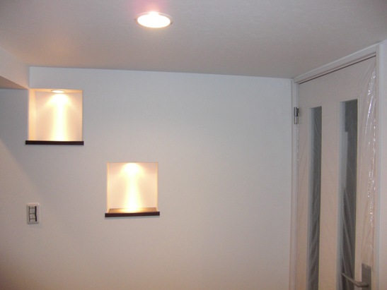 2Fドアは白で床はブラウン。 大工さんの提案でこんな 造成完了で大工さん最後の日 ニッチに照明付けました。 すごい棚が!! 記念撮影しました。朝いないと なんだか寂しいです。