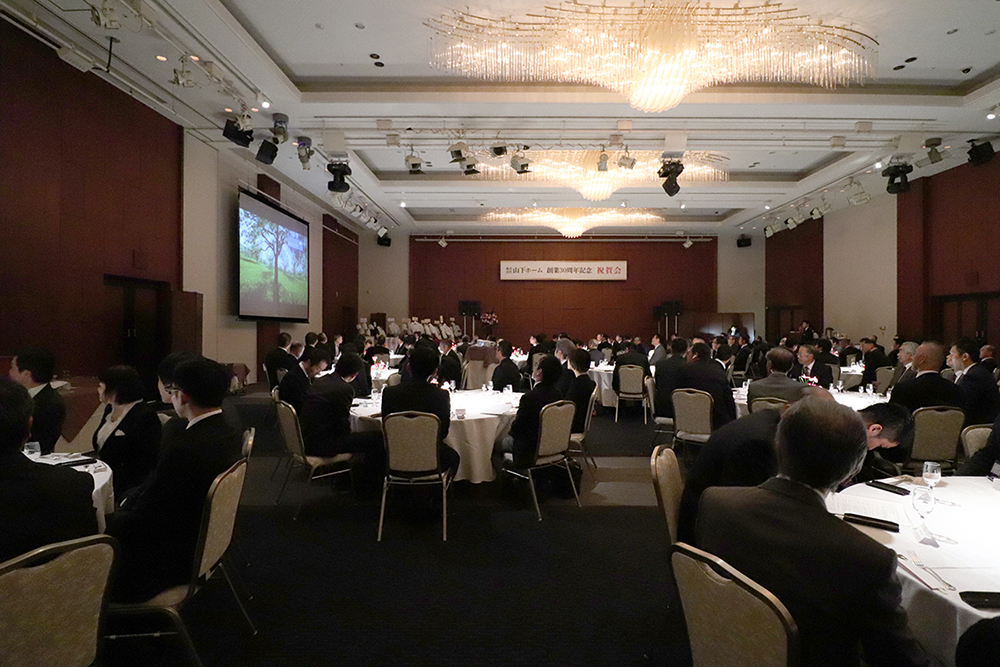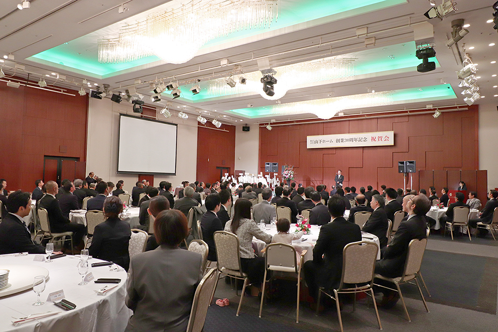 当日は協力会社様、職人様、従業員など合わせて約140名の方にご臨席いただきました。 この30年間を振り返り、創業当初の思いや、これまで山下ホームを支えてくださった皆様への感謝の気持ちを述べ、パーティが始まりました。