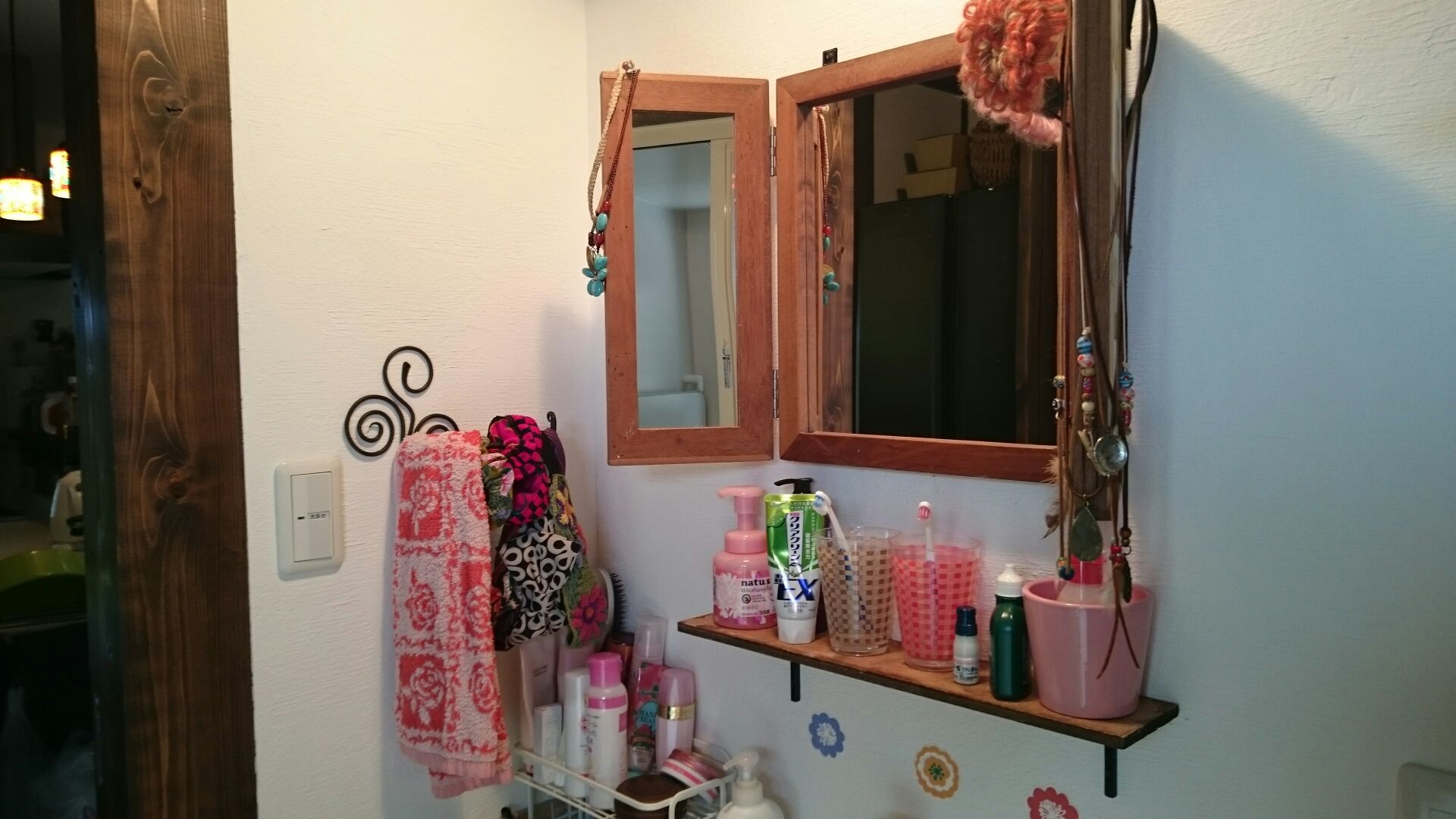 ①造作の洗面台と、雑貨屋で購入してきた三面鏡の間に棚を付けました。