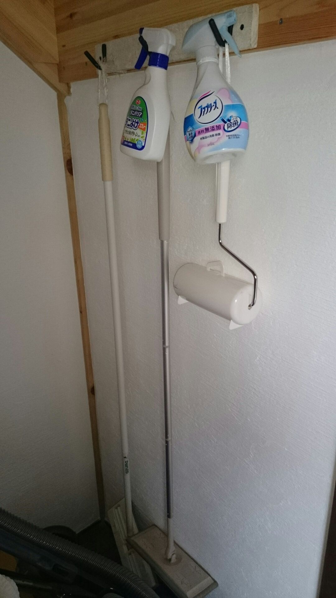 ③階段下物入れには、フックを取り付け、掃除用具を掛けて。余り床にモノを置きたくないので