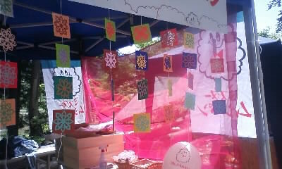自宅から、派手めな布と、飾り(お茶会でも登場したきり絵)を持参していった。