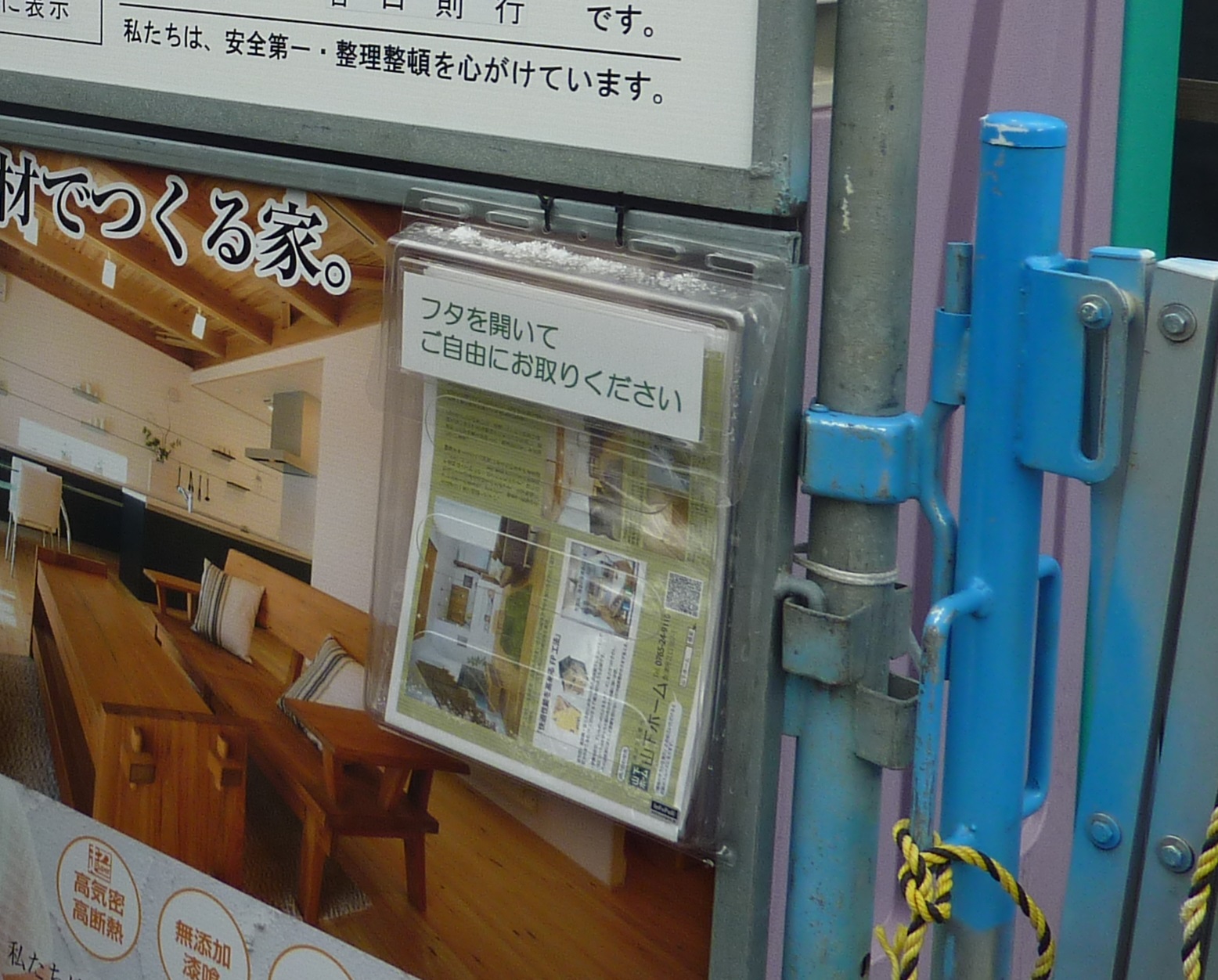 そこで今、現場の前に建てている工事看板の下にPR用の看板とチラシを設置し、通りかかった方に自由にお取りいただけるようにしています。