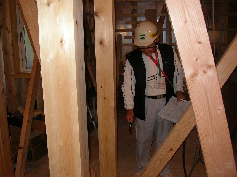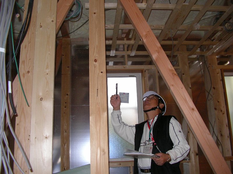 昨日、無事にS様邸の性能保証協会の検査を終えました。 検査内容は「保証内容に準じた構造になっているか?」、 「適切な場所に金物が付けられているか?」などを確認するもので、 検査員の方もじっくりと検査されていました。 現在、外部では破風の板金を施工中です。 内部では天井にプラスタボードが貼られ、だいぶ部屋らしくなってきました。 検査員:性能保証協会 野住さん 立会人:政田      大橋