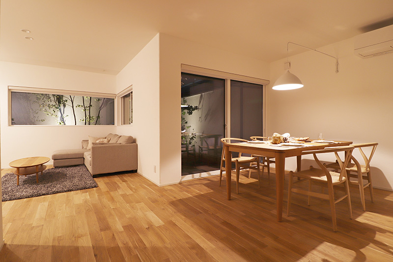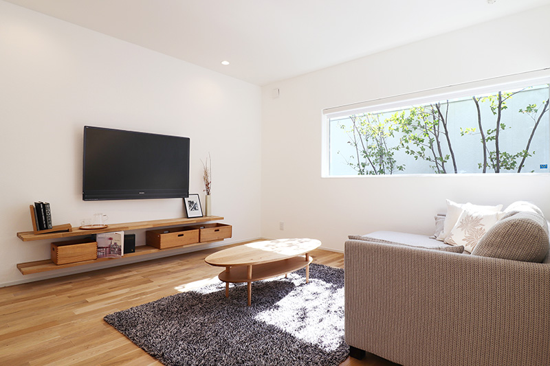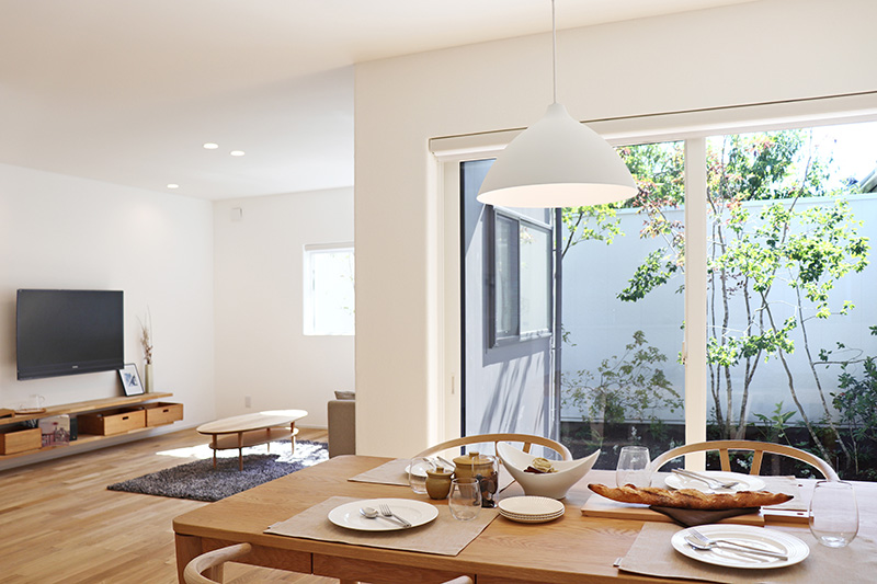 リビングは中庭の緑が見える癒しの空間。