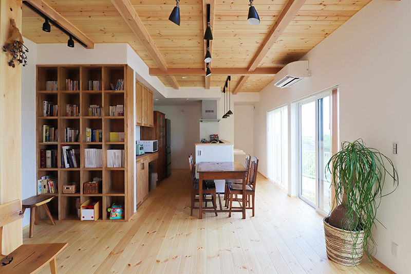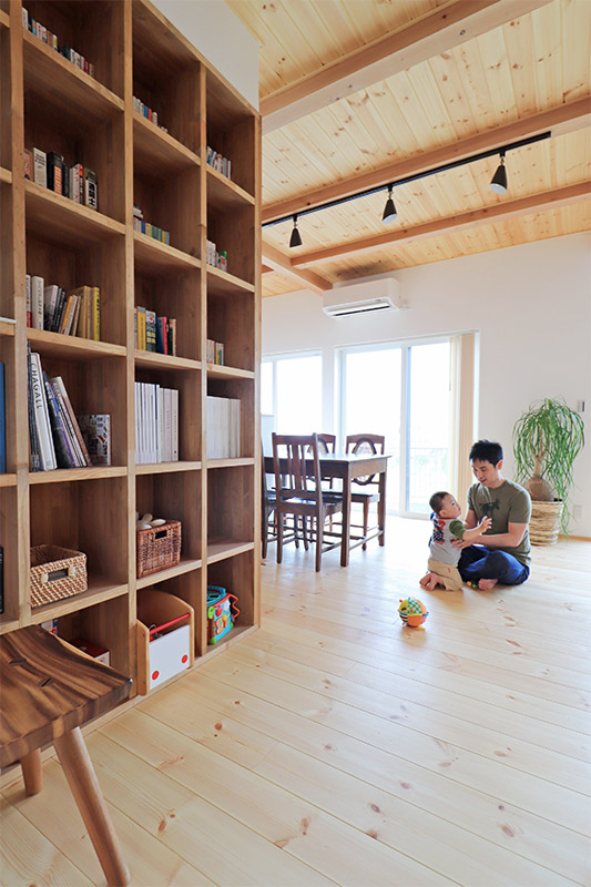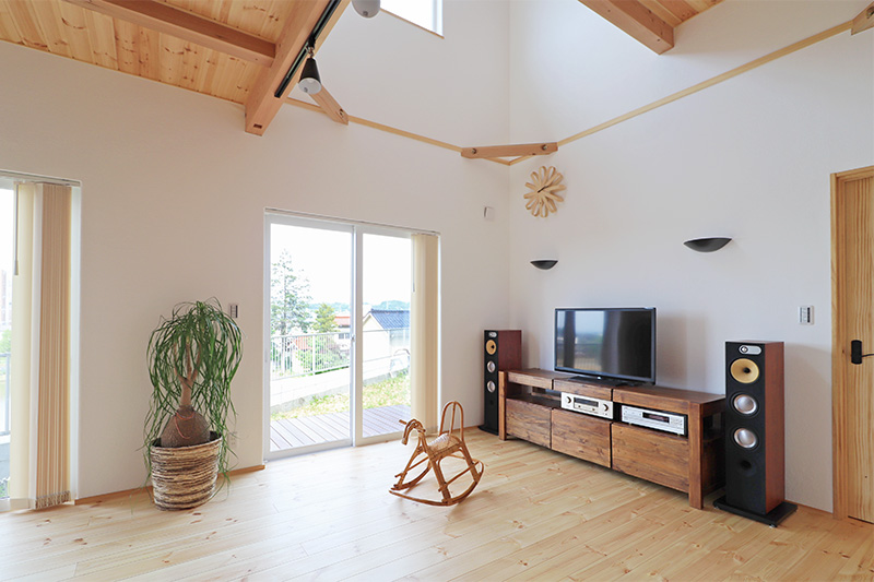 無垢材を床、天井などふんだんに使いあたたかみを出したナチュラルな室内は、ご家族みんなが心落ち着く場所。明るくて風通しがよく、自然体でいられる家、そんな素敵なお住まいに仕上がりました。