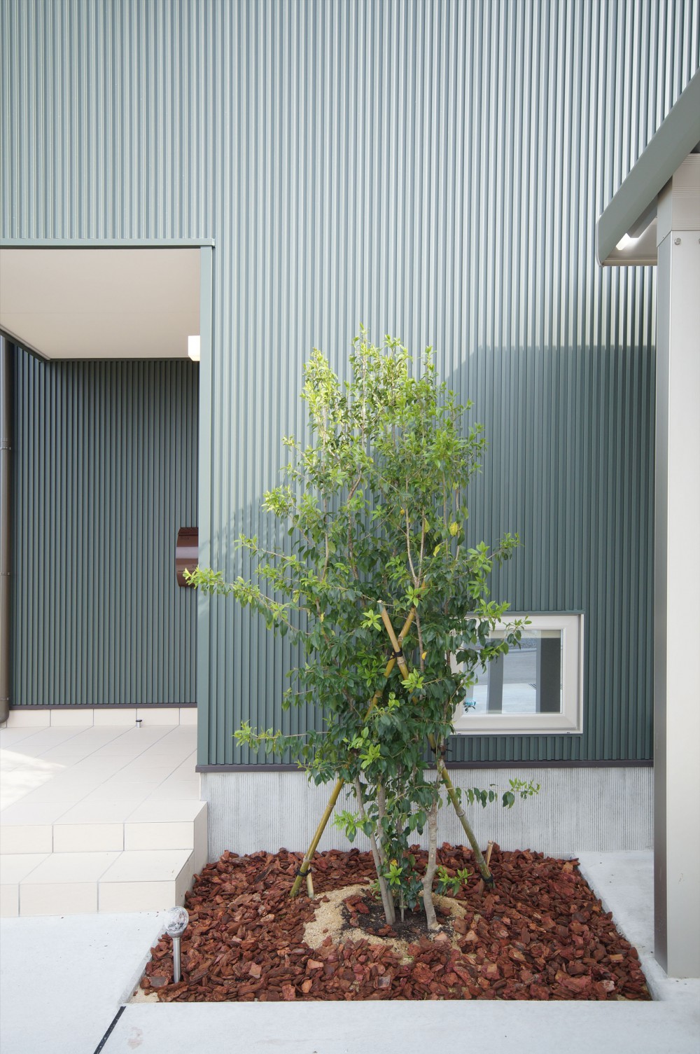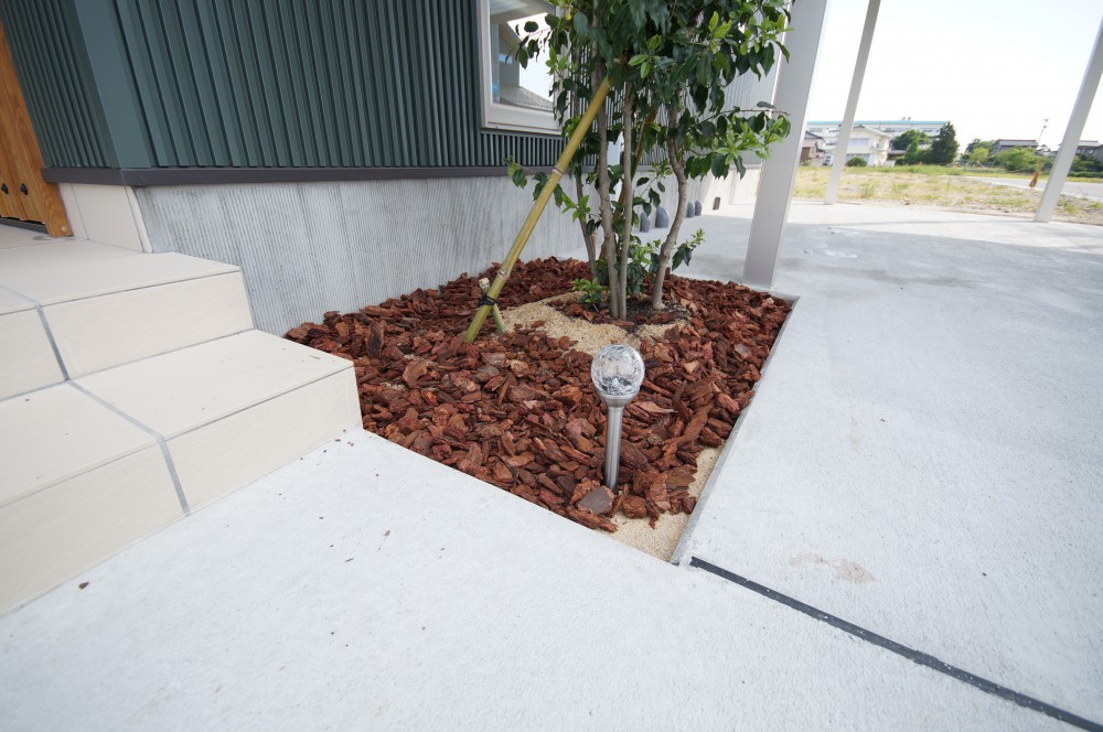 シンプルな外観に1本のシンボルツリーが存在感を放っています。「ソヨゴ」という品種で常緑樹の中でも人気のある樹木です。名前の由来は葉が風でそよそよと揺らぐ様子から付けられたそうです。病害虫にも強い部類なので皆さんのお庭にもいかがでしょうか?