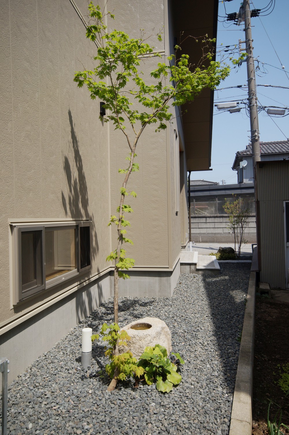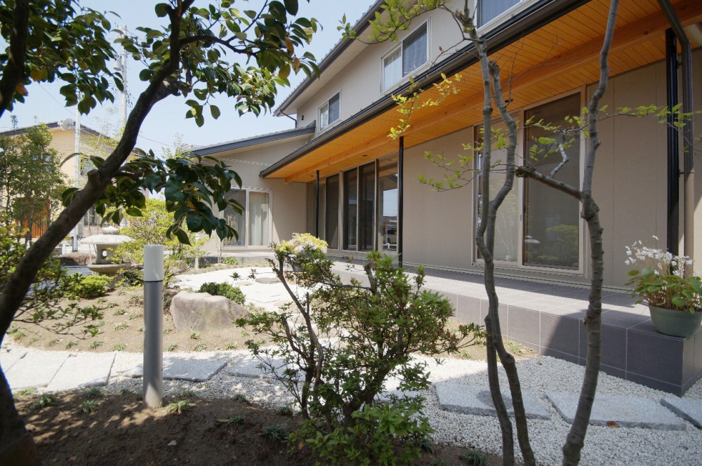樹木はほとんどが隣接する実家からの移植です。純和風ではなく現代的にアレンジした和風庭園を目指しました。 砂利・景石・灯篭・照明・配植、どの角度から眺めてもバランス良く仕上がりました。