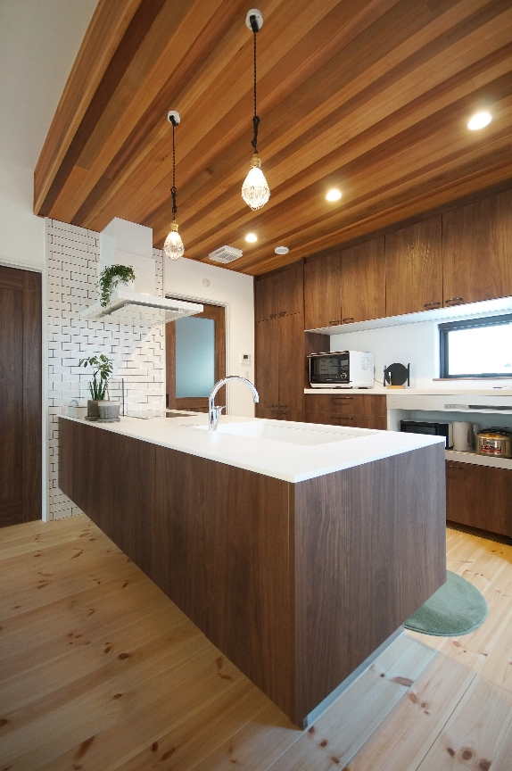 キッチンは壁の一部をタイル貼り、天井は板貼りでカフェのようなオシャレな空間に。