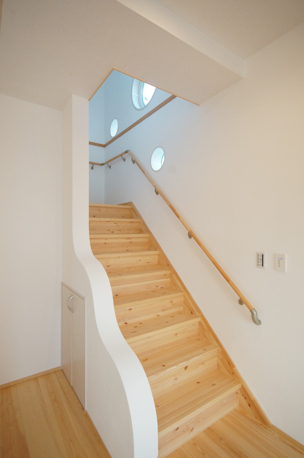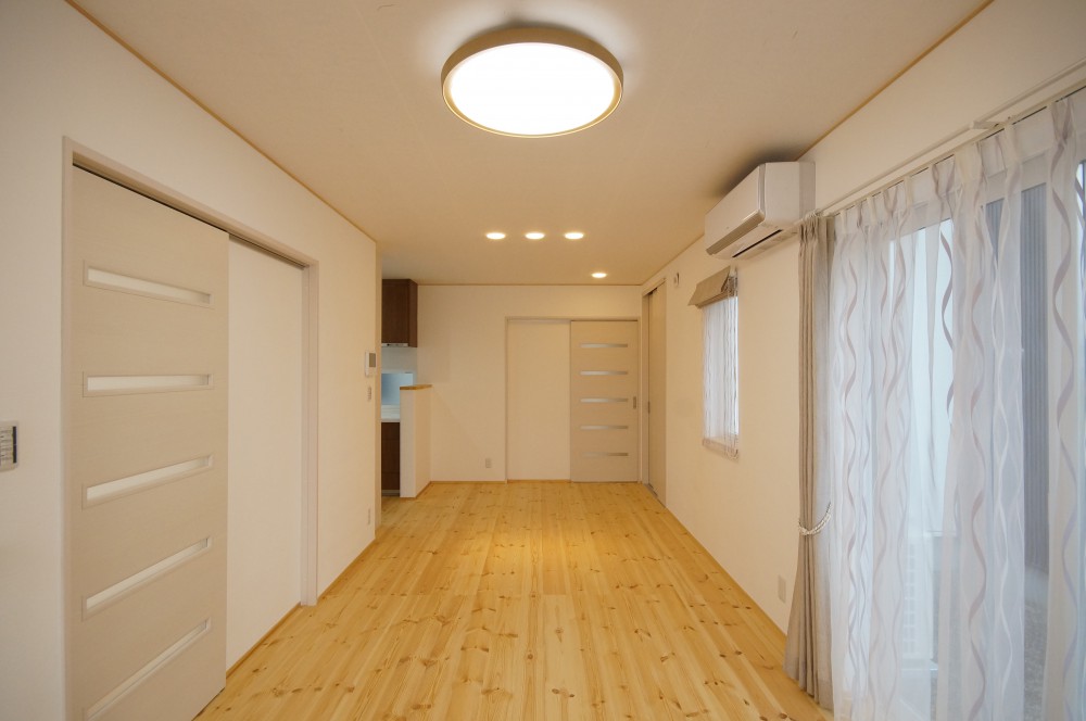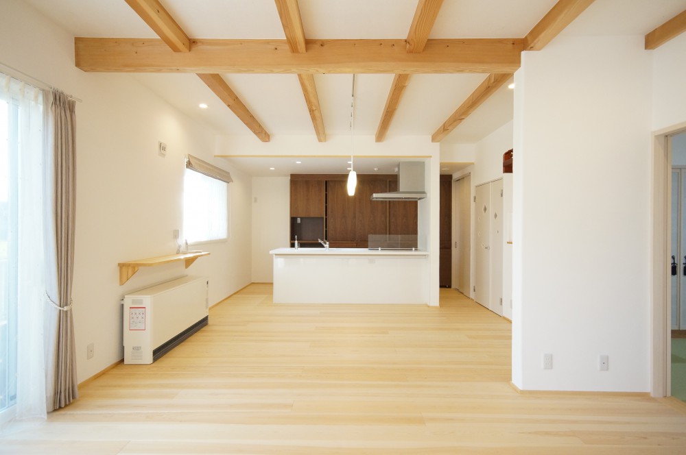 65坪という広さも、高気密・高断熱のFP工法なら、どの季節も快適に過ごせます。ガルバリウムの外観部分の子世帯と漆喰塗りの平屋部分の親世帯、異なるライフスタイルを持つご家族が、ほどよい距離感で暮らせる1つのカタチです。