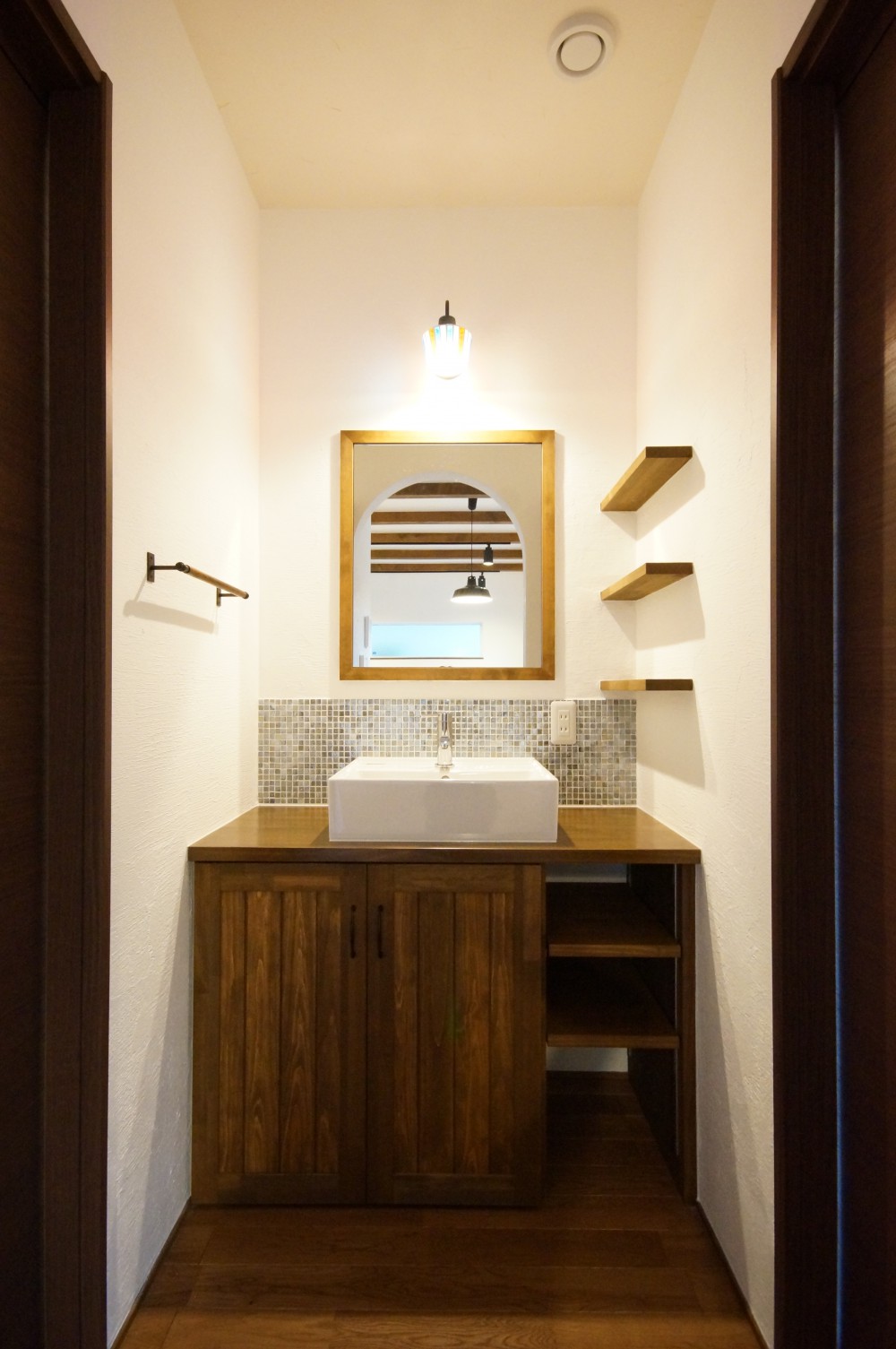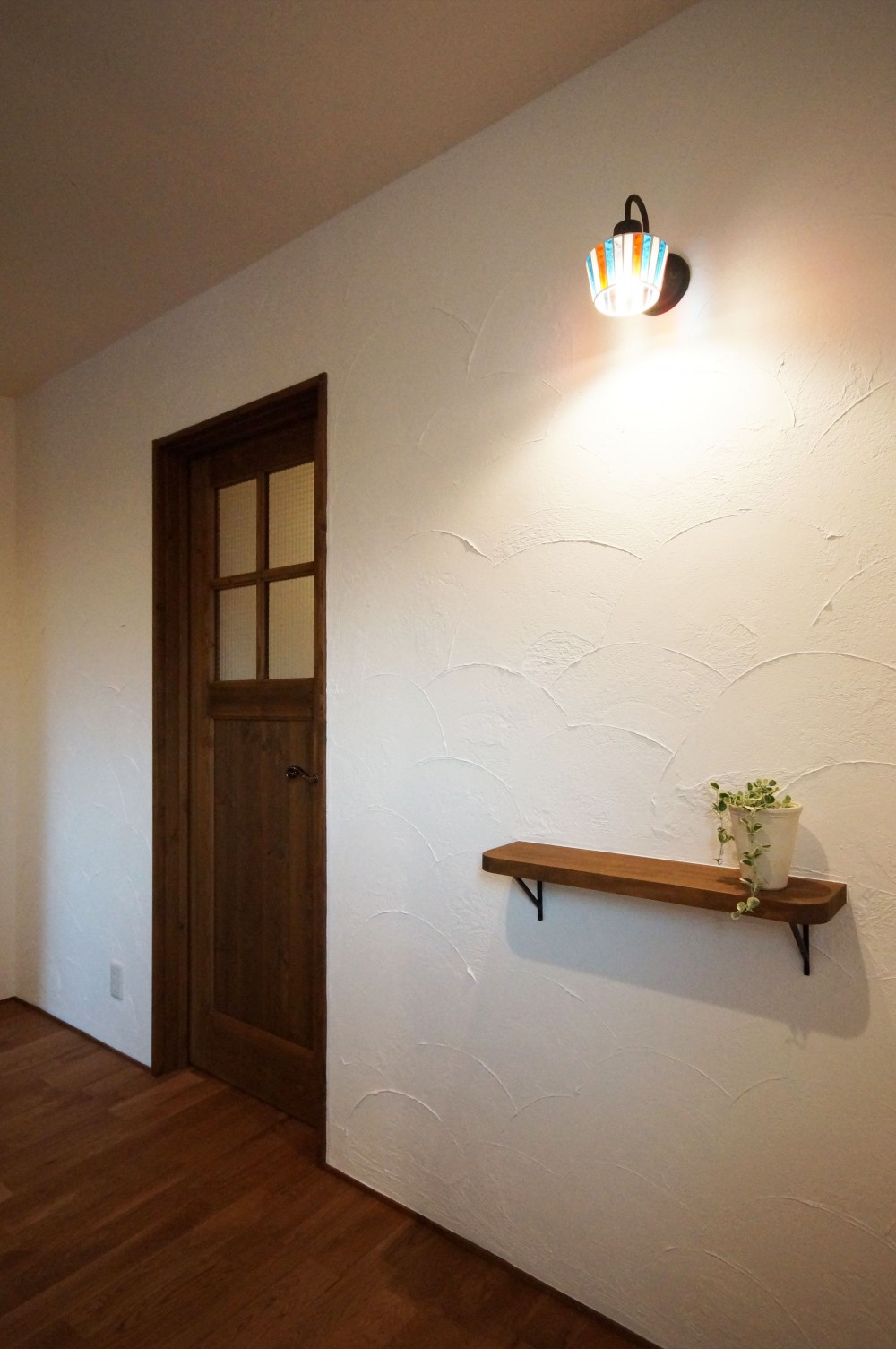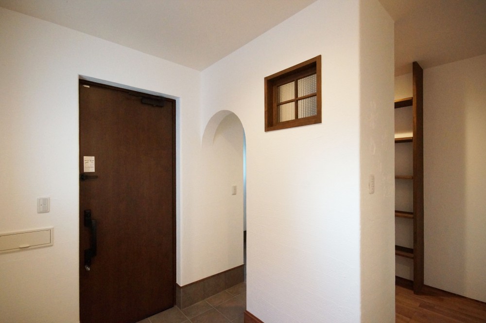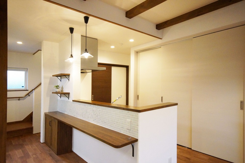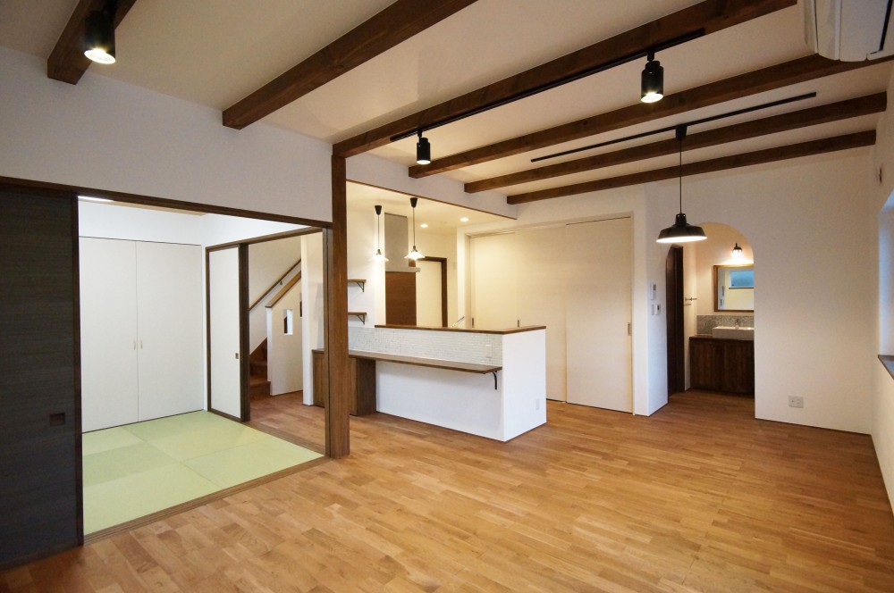 漆喰や無垢材等の自然素材は、アール壁やタイルと相性抜群!無塗装の素朴で爽やかな雰囲気も捨てがたいですが、黒の照明や、自然塗料で着色したナラ材の床が、落ち着きと高級感を演出した、魅力ある空間に仕上がりました。