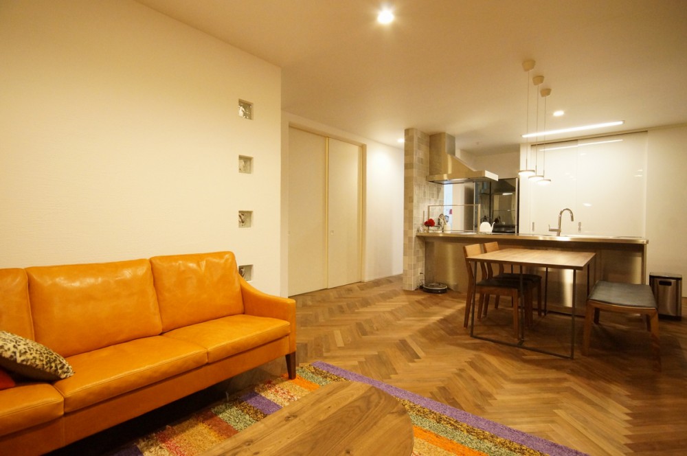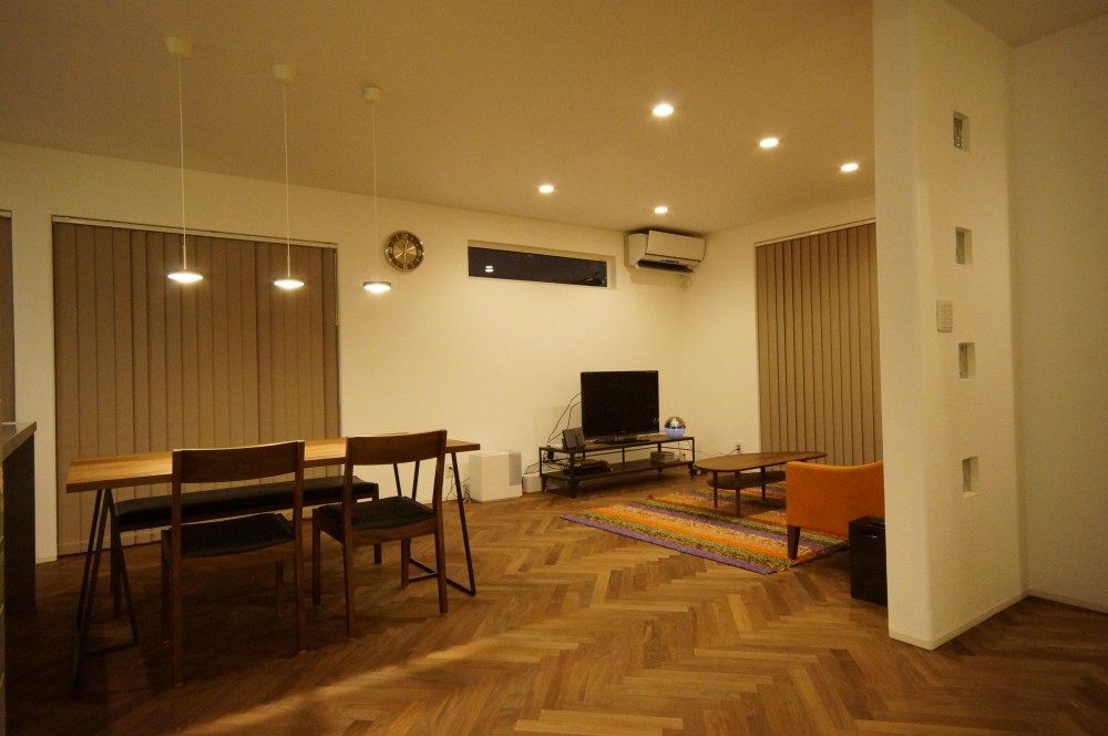 シンプルなオシャレが好き、というご夫妻が一番こだわった、ヘリンボーンのフローリングが印象的なお住まい。オールステンレスのキッチンや、アイアンの階段手摺が自然素材で仕上げた空間をモダンに演出しています。