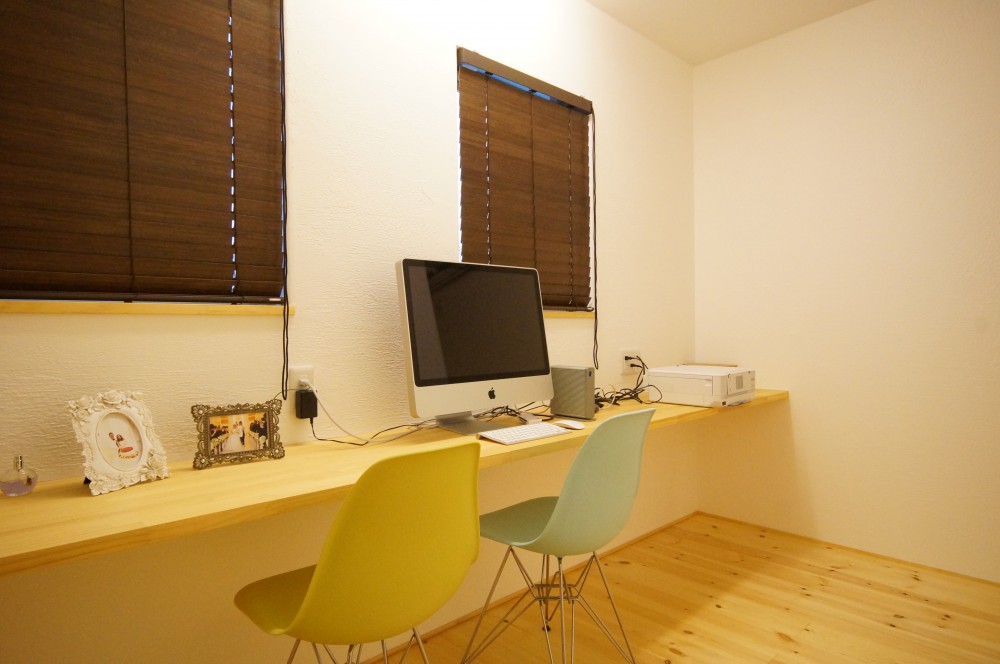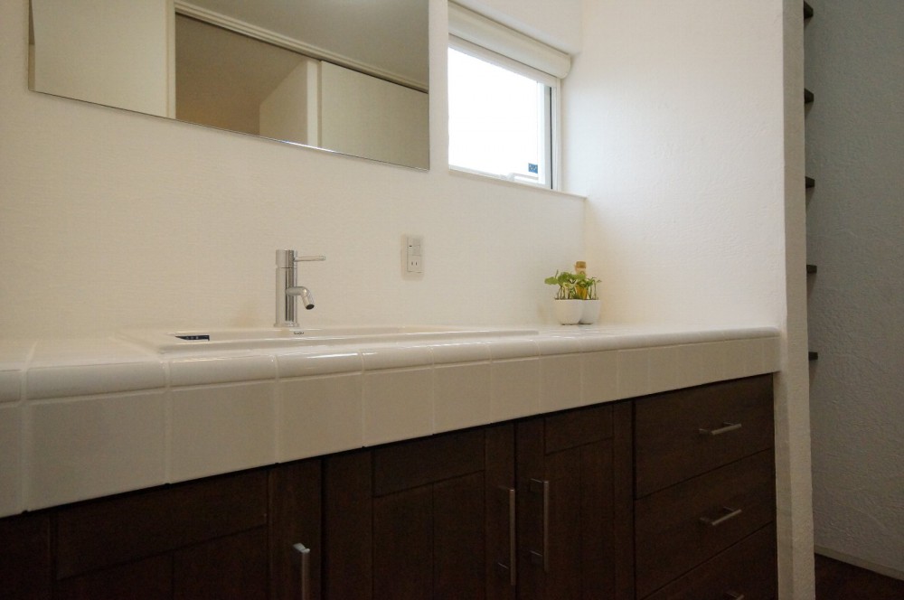 ナチュラルな仕上げの2階に合わせたオリジナル手洗い。