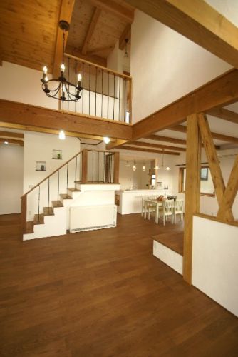 床・柱の色に茶を使用し、落ち着いた雰囲気を作っています。 漆喰の白壁が引き立ちます。