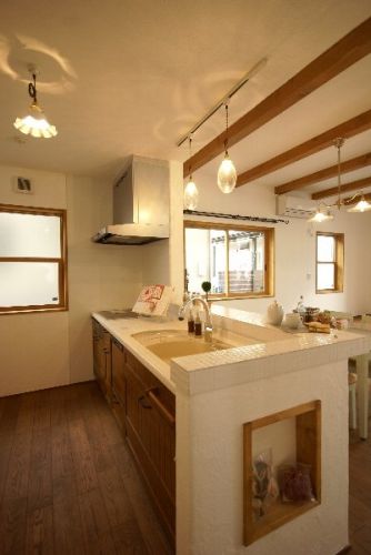 キッチンです。 照明がとてもおしゃれです。 キッチンカウンターのサイドに飾り棚があます。