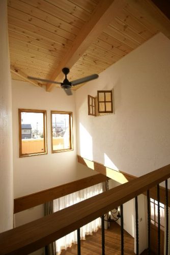 2階からの吹抜けの眺めです。 シーリングファンも黒色で落ち着きを感じます。