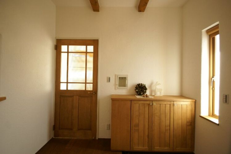 玄関です。 リビングへの扉にはチェックガラスとモールガラスを使用しています。