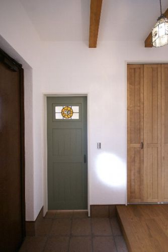 左端が玄関扉、中央が収納スペースへの扉です。 ステンドグラスがはめ込まれ、この扉だけが他と色が違うのでアクセントになっています。