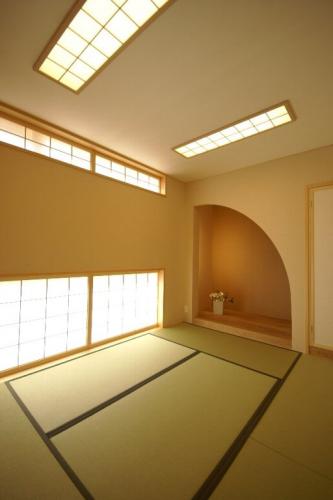 和室も障子の位置を変えるだけで粋な雰囲気です。天井の照明が埋め込まれ、障子をはめてあるのも面白いですね。
