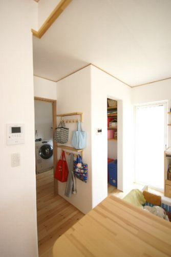 食品庫:すぐ取り出せて、来客からは見えないのがいいですね。 バック類は床に置かず、ハンガーに掛けてスッキリと。