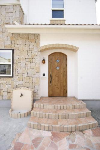 無添加しっくいの壁に、天然石が貼られた外観。窓の上下にはレンガが貼られました。アプローチも素敵です。