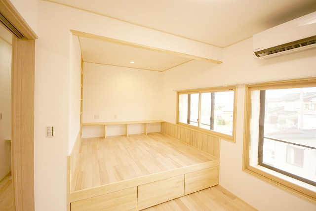 寝室。作り付けの寝台を造作しました。 サッシは既存のを残し、その内側に内付けサッシを付けました。