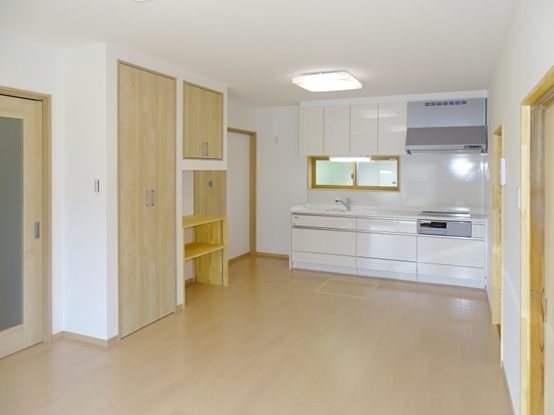 全体的に経年で古くなっている、浴室が狭い、脱衣場が通路兼用等、使い勝手が悪いので間取変更を含めてのリフォームを行いました。 廻りはトイレ、浴室の位置を変更し、それぞれのスペースは広くありませんが、独立した形の間取りになっています。 LDKは台所と居間の壁を撤去して繫ぎ、広い空間にしました。元々収納が全くない部屋だったので、圧迫感の無い程度に収納棚を製作しています。 それ以外でも断熱、オール電化、内装工事範囲以外のサッシ入替、全体の外壁工事を行っています。
