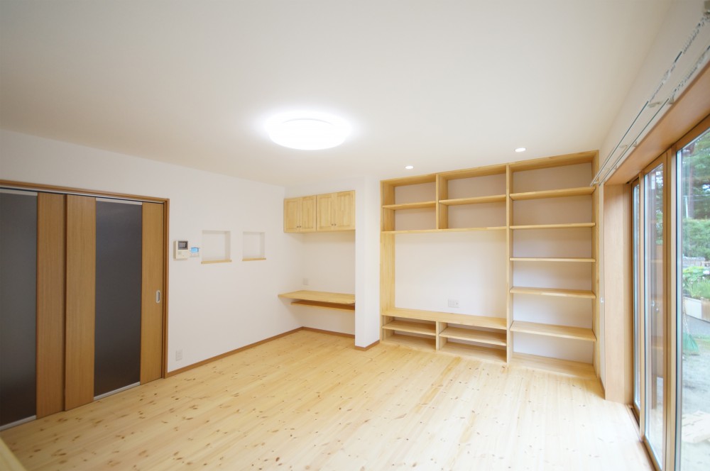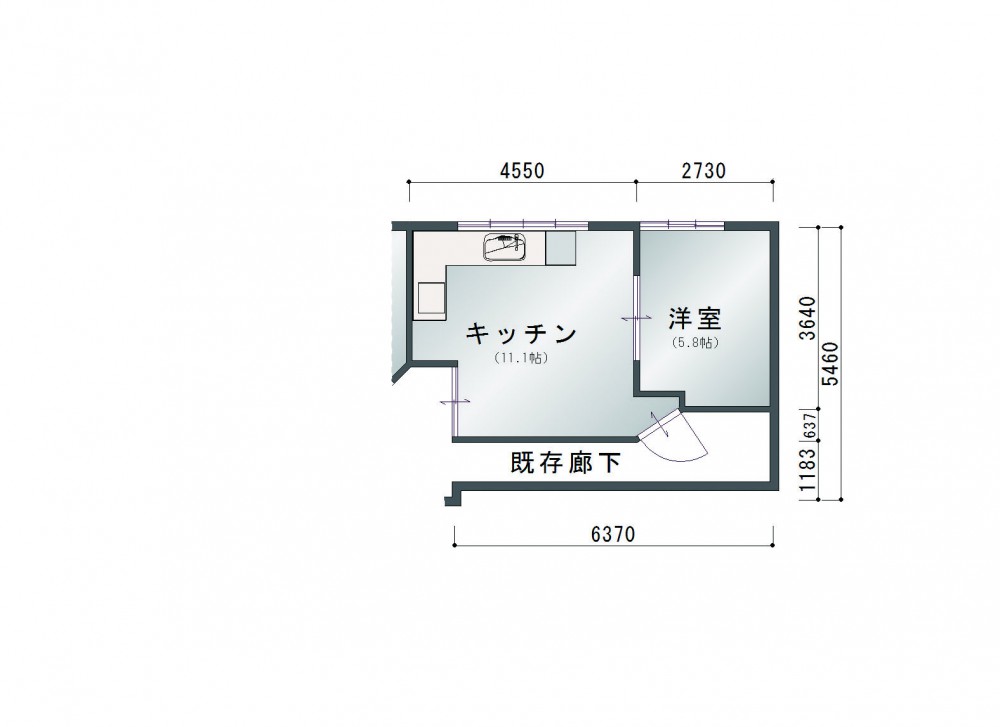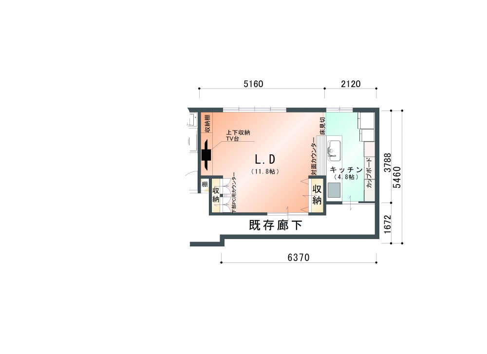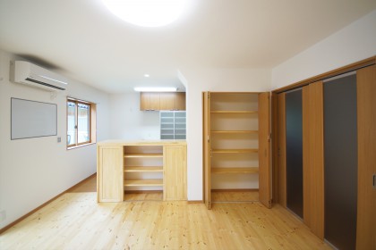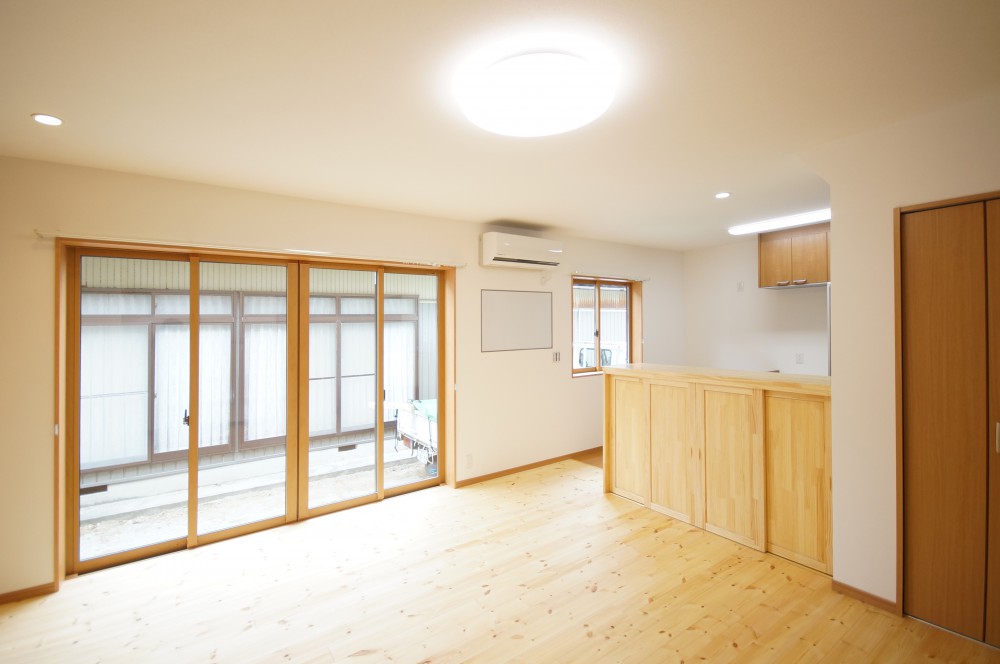 ダイニングキッチンと隣の部屋を1つのLDKにしました。リビングダイニングの床は赤松無垢材を使用しています。キッチン部分(図面青色部分)は汚れてもメンテナンスしやすいように、カラーフロアを採用しました。壁一面にPC用デスク・TVボード・収納棚を造作し、たくさんのものがスッキリと収まるようにしました。また、元々あった窓を、掃き出し窓に変更することで、部屋が明るくなりました。キッチン裏には構造上抜けない柱があったので、収納の中に収めてあります。一家団欒の場にふさわしい、明るく綺麗な空間に仕上がりました。