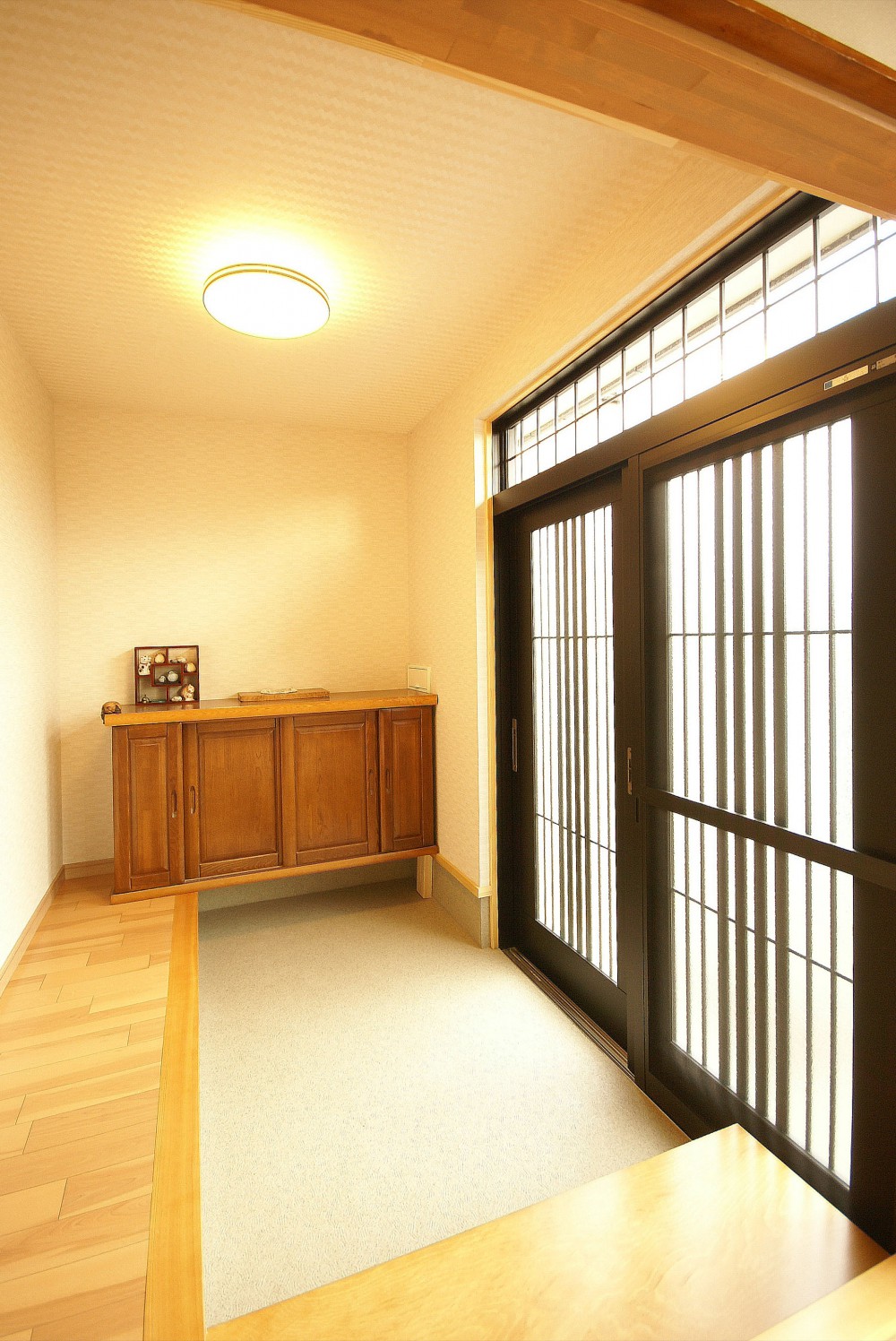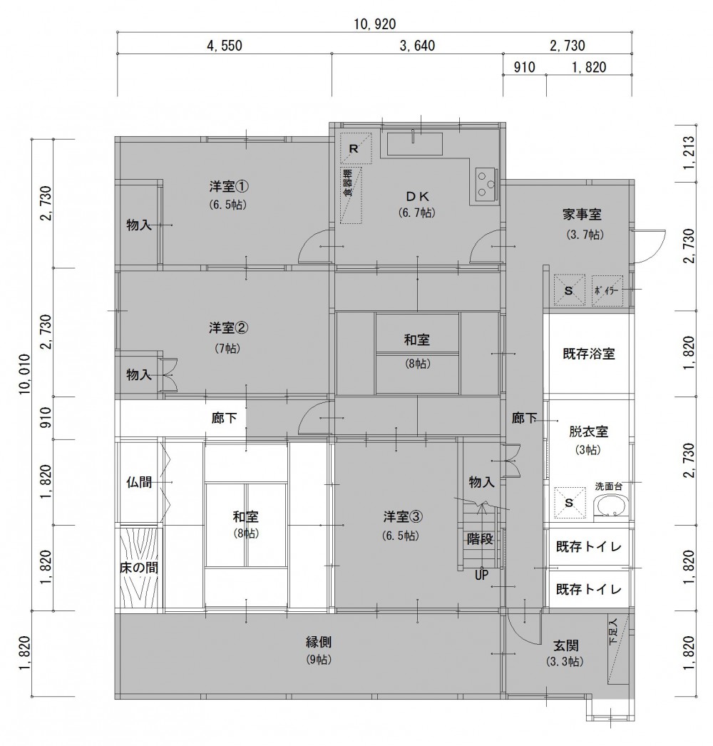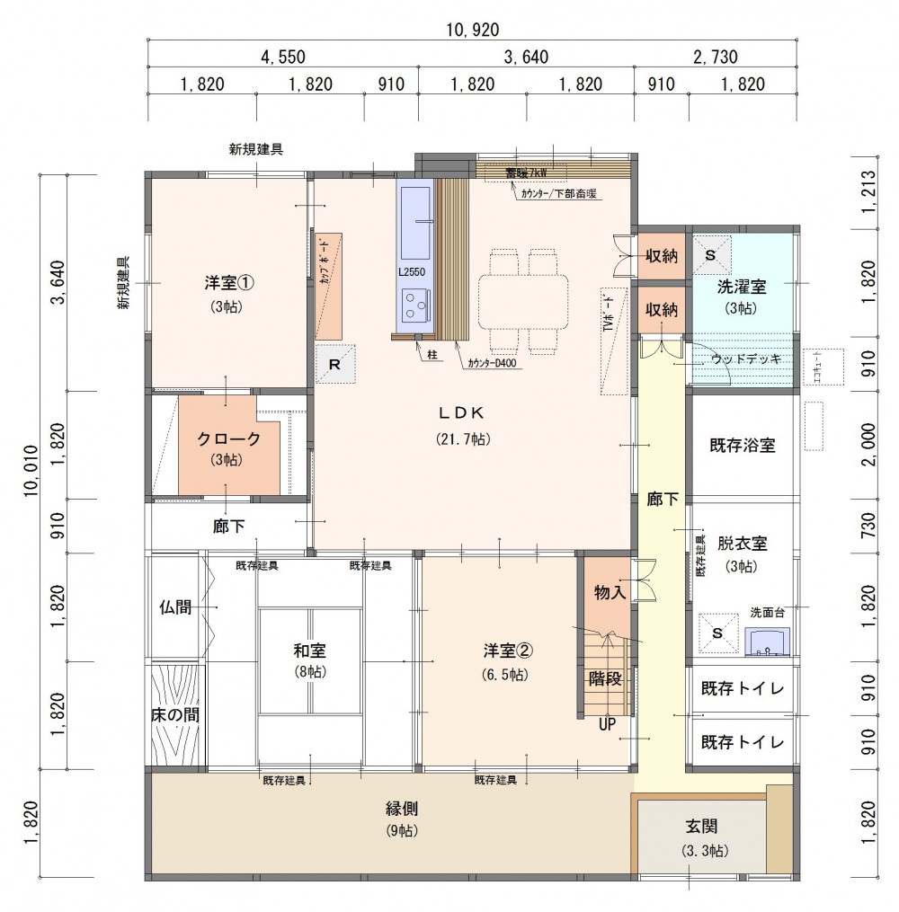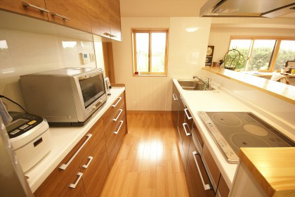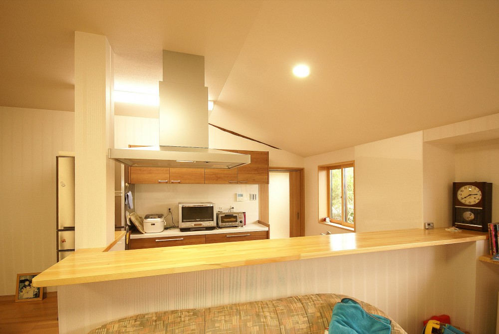 玄関から廊下と床の間のある和室の間取りを残して、1階の改装を行いました。昔ながらのダイニングキッチンは、対面キッチンのある広々としたLDKに。ご家族がそれぞれゆったりと寛げる広さです。対面キッチンには、手元が隠れる高さのカウンターを設けました。リビングから乱雑になりがちなキッチン手元への視線を遮ってくれます。作業しやすく、来客時にも生活感が出ないように配慮しました。家事室は、より使いやすい洗濯室に。家事をラクにしてくれる2台の洗濯機は、1台の位置を少し変えただけで、そのまま活躍してもらうプランです。