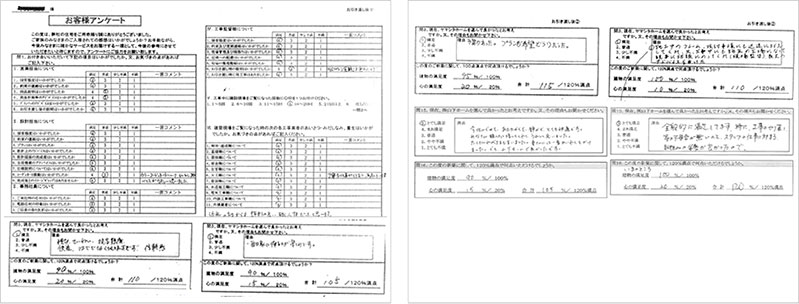 3ヶ月後、1年後にすべてのお施主様からアンケートを頂いております。お客様のお喜びの声や、私たちでは気づかなかったこと、改善すべき点などを教えて頂き、これからの家づくりに反映させて頂きます。ですから、私たちはこのアンケートをとても大切なものと考えています。