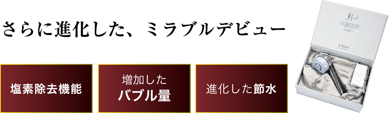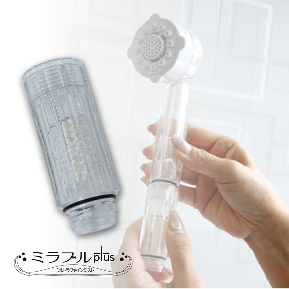 ウルトラファインバブルとは、1μm未満の泡の事(ISO国際標準規格)。マイクロバブルよりさらに小さく、非常にすぐれた洗浄力を持っています。「ミラブルplus」は、勢いのあるストレートとより微細な気泡を毛穴まで届けるミストに、ワンタッチで切り替えて使える画期的な「シャワーヘッド」です。ウルトラファインバブルを含んだ洗浄力の高い超微細空気混合水をヘッドに内蔵された特殊機構で作り出し、シルクに包み込まれるような上質な肌感触を実現しています。超微細気泡を含んだ水は、抜群の洗浄効果で顔・肌・髪を美しくし、さらには節水効果も高いという、美容にもお財布にもうれしい特長があります。他にも「トルネードスティック」を接続する事により、塩素除去機能をプラスし、ファインバブル量の増加を実現しています。