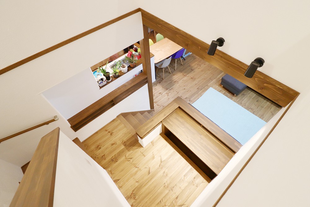 三段ぐらいの段差にしたので吹き抜けにする必要もなく、空間を有効に活用しました。